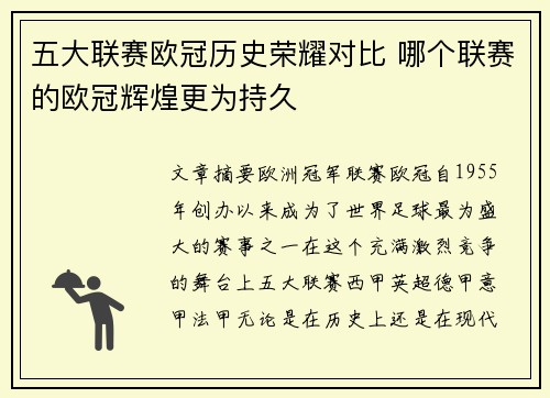 文章摘要:欧洲冠军联赛(欧冠)自1955年创办以来,成为了世界足球最为盛大的赛事之一。在这个充满激烈竞争的舞台上,五大联赛(西甲、英超、德甲、意甲、法甲)无论是在历史上还是在现代的欧冠赛场上,均有着辉煌的成就。然而,哪些联赛的欧冠辉煌更为持久?本文将从欧冠冠军数量、联赛竞争力、球队历史表现、球员影响力等四个方面对比五大联赛在欧冠历史上的表现,并探讨哪一个联赛的辉煌最为持久。通过这一分析,我们将更加清晰地看到五大联赛在欧冠历史中扮演的不同角色以及他们的荣耀在时间长河中的持久性。